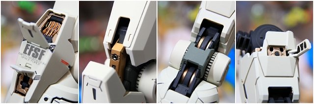 ハッチ開閉。中央の明るいグレー部分はシールドマウントです。回転可動は残してありますが構造上かなりキツめに設計してあるので、あまり動かさないほうが良いと思います。シールドを背中に背負わせたいときだけ慎重に動かしてください。