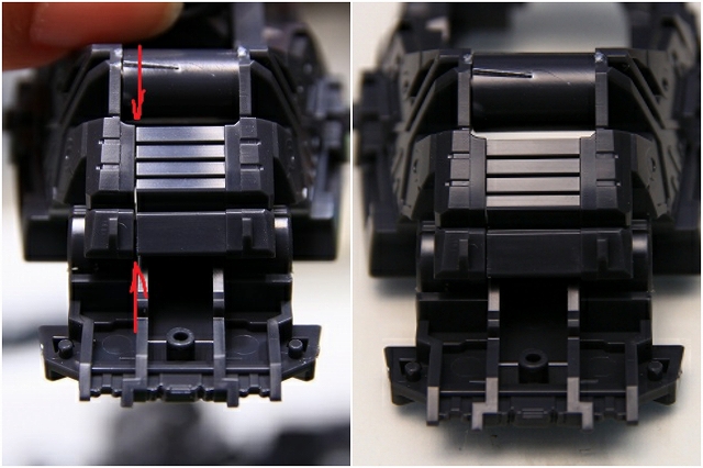 ふとももの白いパーツの前後の合いが悪く、隙間ができます(個体差?)。また後ろ面のハッチの閉まりが悪い。それぞれ赤い部分を加工すると解消します。