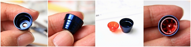 ガンプラ初(?)のメタルノズル。たぶんアルミにブルーのアルマイト。重量感のあるメタリックでとても良いコーティングです。内側にはLED発光のためのクリアーレッドのパーツ。