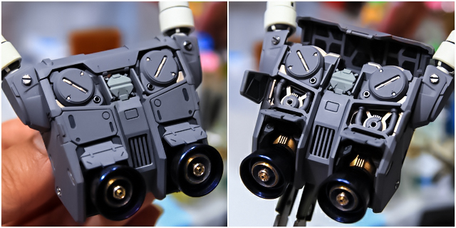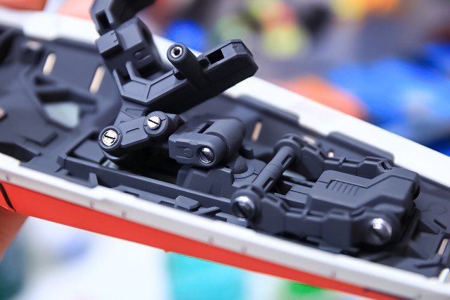 胴体には手足・首・コアブロック・バックパックなど多くのユニットが取り付く上に、さまざまな可動もあるため、少々強度が足りずグラグラします。なので全体的な強度をアップさせる工作に重点を置きました。肩甲骨の2重可動、腰の赤部分のスイング伸縮、上半身と下半身をつなげるプレートフレームなどを改善しました。