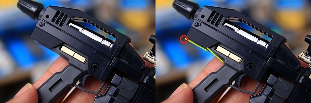 ライフルの角度を最大限上向けにすると、銃底の赤丸の部分が上腕にあたってしまいます。ちなみに普通のポージングの範囲内なら問題ないです。今回は加工してみることにしました。緑線の2本ラインに角度が付いてるので・・・
