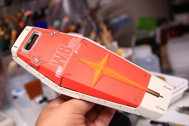 シールド表面はアニメのように柔らかい曲面構成になっていて、とても良い感じ。それにあわせて連邦十字の取付面も湾曲していますが、ただやはり3D曲面同士の取り付けは精度が難しく隙間ができがち。仮組みの段階で何度も何度も調整して、ピッタリ収まるようにしました。