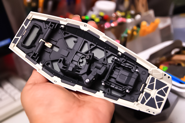 ほぼすべてのスナップフィットをMKカットしてクリアランス調整、スルスルピタッと組み立つようにしました。接着剤は使用しません、なぜなら経年劣化するからです。固定はネジで行い、可動部にはグリスアップ。こういった処理を全身に行っています。