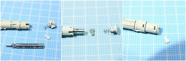 これが改変後のサーベル。電池のフタが皿状でバネが露出している。さらにストッパーが追加になっている。