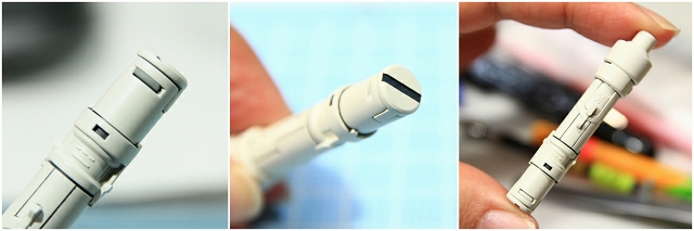 ガンプラでは初(?)のメタルパーツ。しかし中心が貫通しておらず底が丸見えで、せっかくのメタルパーツの利点が生かせていません。対策としてマズル内部をグレーで塗装し、インナーにステンレス製PPアポジ1.5mmを埋め込みました。