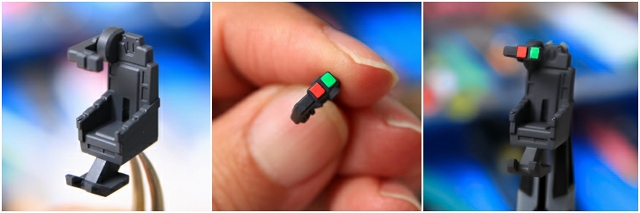 ちなみにこのコクピットの前後動作がLEDのON/OFFスイッチに連動しています。しかしコクピットの形状のせいで指でつまむのが難しく、可動自体も複雑。スイッチ連動がフワフワなので、何度もなんども動かしてみてやっと偶然スイッチONになる。モードを切り替えるにはさらにスイッチを短く押す、しかし押せない。これを1秒以内に行わないと自動的にOFFになる。手間取って長く押してもOFFになってしまう。やっと点灯してもLEDタイマーが1分と短いので、あっというまに消えてしまう。「スイッチONにするのが非常にむずかしい。たとえスイッチONにできても、棚に立たせて、遠くからじっくり鑑賞するということが事実上不可能」という状態です。