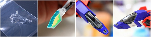 というわけで今回はLED発光はオミットしました。センサー系は塗装で仕上げます。クリアーパーツはヒケやバリがすごいので、ヤスリで全面成形&下地足付けし、ベースコートから時間をかけて塗装を重ね、しっかり発色するように塗装しました。