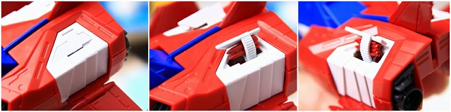 股間の連邦マーク部分は「大気圏突入」で使用した冷却機構が再現されてます。この赤いパーツの上端は、フレームと可動用ハンドラも兼ねているので、グレー等で塗り分けしました。開く時は赤い部分を押し下げて、閉じる時は上端のグレー部分を押すと閉まります。