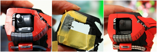 キットのモノアイは透明パーツ1個だけの簡略なものです。ガラス製レンズと丸皿モールドに交換しました。透明モノアイカバーは厚さや形状など精度が悪く、加工したとしても良い表現にはなりません。バイザー無しのほうが模型としてもメカとしても良いと思います。