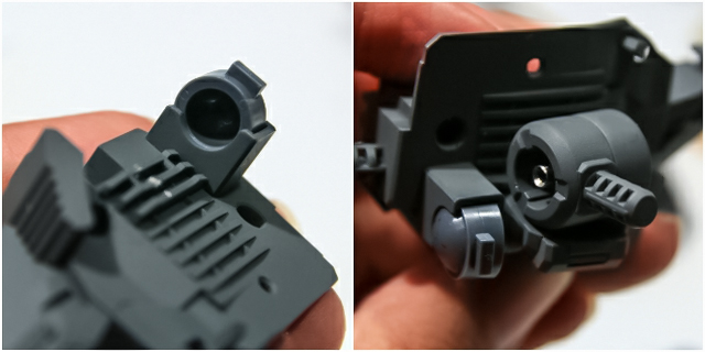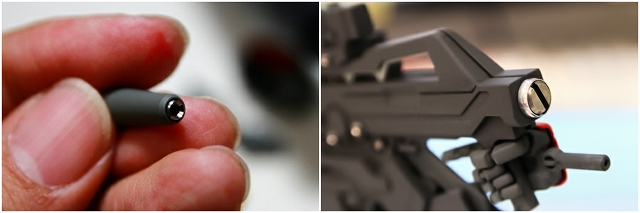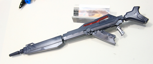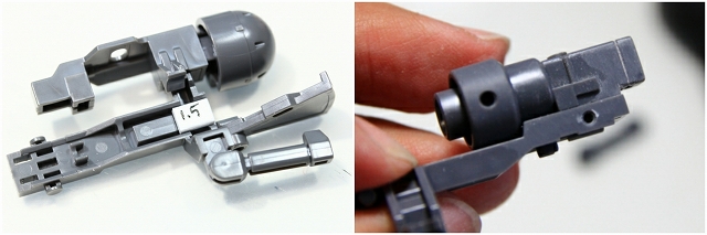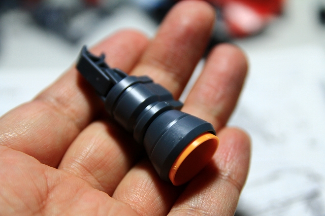 マズル先端にPPアポジを埋め込み。三角形の銃底パーツは腰にあたって銃をもつことができません。こういうデザインは残念ですね。銃底は取り除いてディテールに置き換えました。