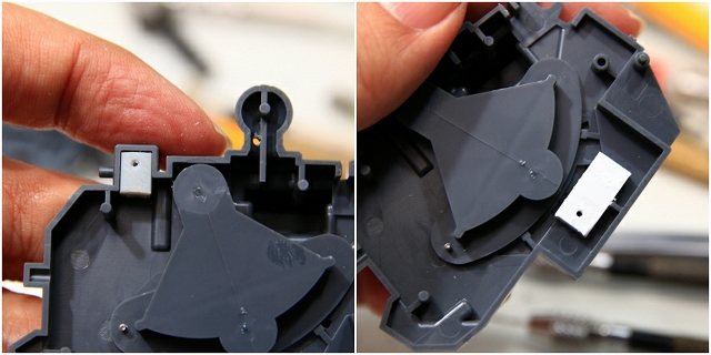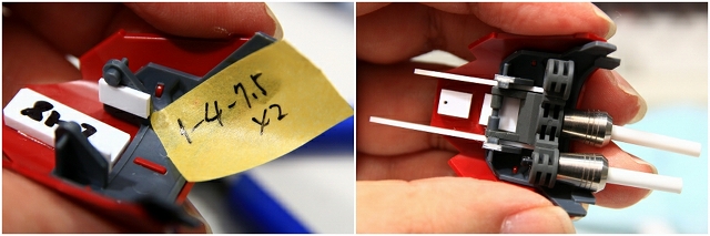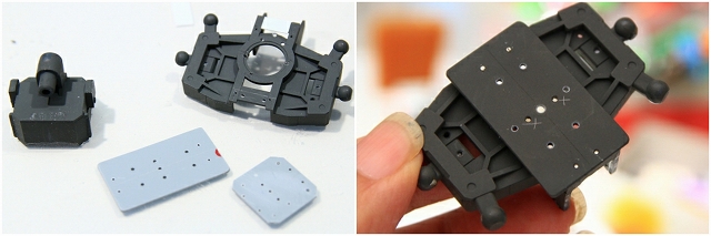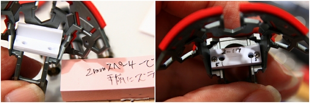 プラ材スペーサーでクリアランス調整、センター出し、位置決め、補強用プラ材追加、ネジ固定。ちなみにここでは10回くらいプラ材を作り直してます。でもキットのネジ穴は2x2箇所だけ。