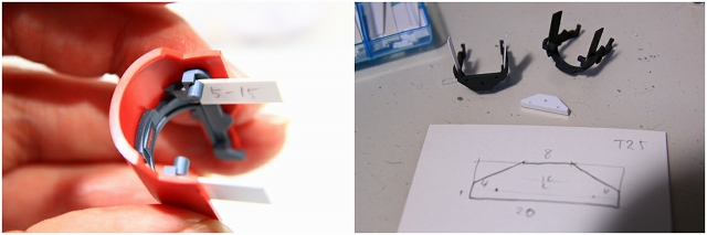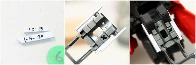 脳内シミュレーションで数パターン。採寸で数パターン。現場合わせの調整で20回くらい。コツとしては「何十回失敗しても納得するまで諦めない」です。技術はもちろん精神的な面のほうが大きいかなと思います。ちなみにここでのプラ板は位置決めのための仮止めプラ板。位置が割り出せたらこれらのプラ板は取り外します。