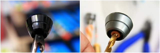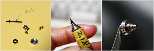 シリンダーシャフト。以前は4mmのシャフトを取り付けるために4mmの穴を開けていました。それだとプラパーツが破損してしまうことが多かった。今は自作の「アルミ製・変換シャフト」が便利です。1mmの穴をあけて差し込むだけで4mmのシャフトが固定できます。さらに、ボアに対してストロークが長いので、4mm穴よりも1mm穴のほうがセンターと強度が出ます。この変換シャフトはシリンダー表現だけでなく、円柱パーツのセンター出しなど、いろいろ便利です。