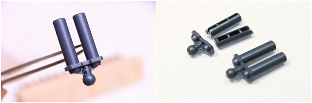 ノーマルだとノズルの向きがバラバラです。これを改善するにはマウントを新規に作る必要がある。しかしキットパーツの殆どに平面がないのでマウントの基部になる部分が無い。さらに4枚の開閉機構の開き具合も完全に揃えなければならない。