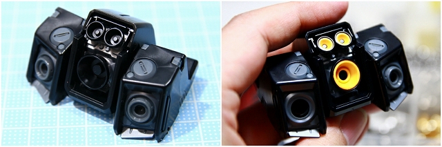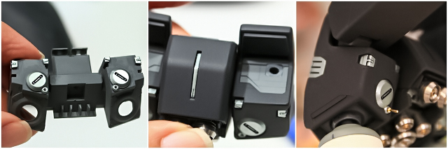 中身はこのようになっています。モナカ割りをネジで締め付けるとパーツが歪んでしまうので、プラ材で面が接触するようにしています。この場合はピッタリサイズではなく、ごくわずかにスキマを作るようにします。スキマの大きさは一定ではなく、パーツ形状や機能によって0.05mm〜0.3mmくらいで適宜調整します。