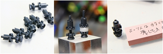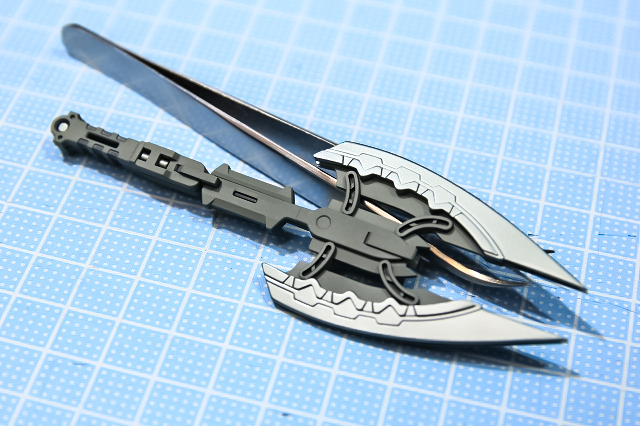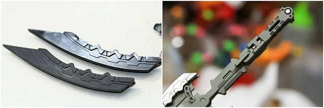 ひとつのキットのなかでも、パーツの表面処理の仕上がりの良し悪しがバラバラです。このサーベル基部の黒いパーツはかなりひどいので時間をかけて修正します。いっぽうグリップのパーツは精度が高い。