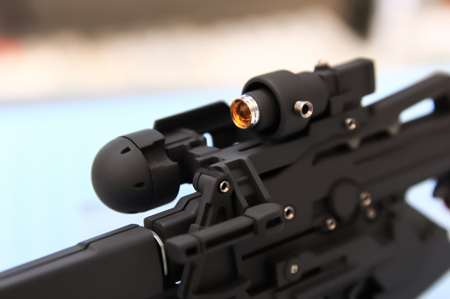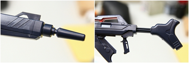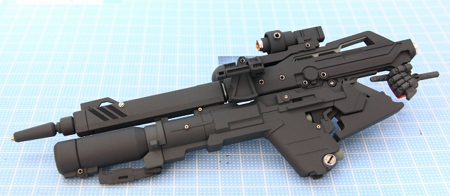 写真のように、ライフルは浮かせた状態でも保持できるように制作しました。ただしどうしても重量があるので、実際のディスプレイではライフル(バズーカ)先端を地面に接地させるのが安定でベストと思います。
