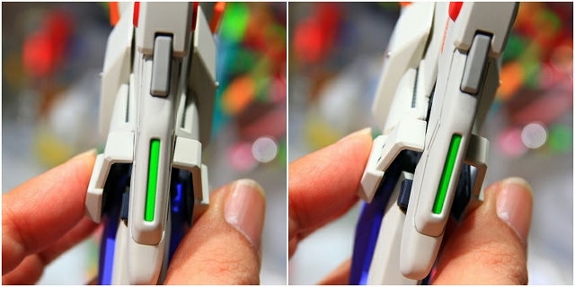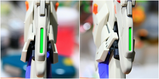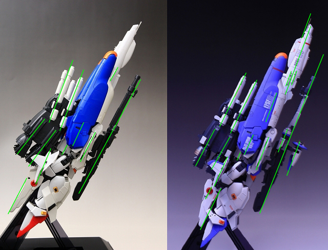 左がノーマル。背中のブースターは設定画から斜めになるデザインです。その他の緑線は平行になるべきですが、ジョイントが弱かったりでバラバラになってしまいます。モビルスーツモードでは多少ずれていても目立たないですが、Gクルーザーモードの場合は少しのズレが美しさに直接影響します。