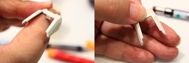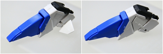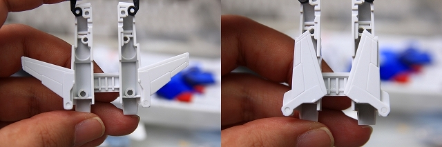 ブースターの角度を変えようとすると、ブースターの小羽根とコアファイターの垂直尾翼があたってしまいます。両方の羽根をカットします。