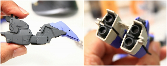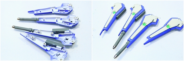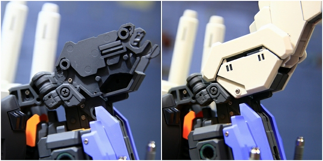 この2機は同じ物を表現しています。奥はコアファイターに周辺装備を脱着できるもの。バリアブルMSの再現性は高いですが、強度は落ちます。手前は機種周辺を一体化したもの。ディテールは省略されますが強度優先。