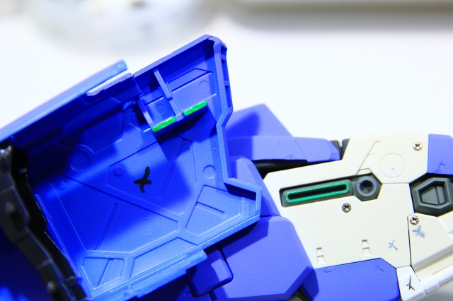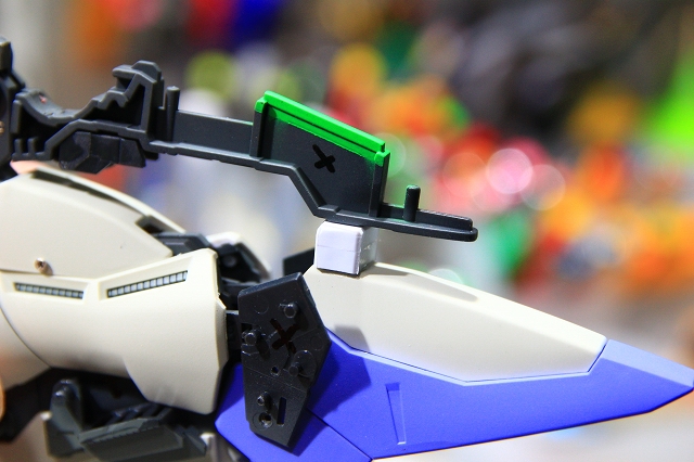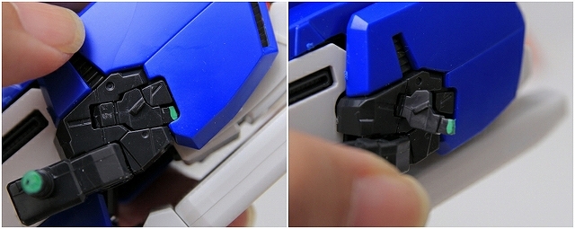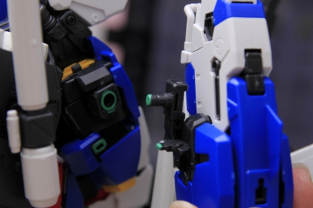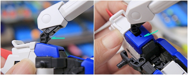肩と上腕をつなげるフレームの、可動とストッパー(緑色)の確認。MSとWRで同じようなストッパーがあります。