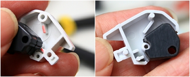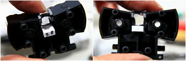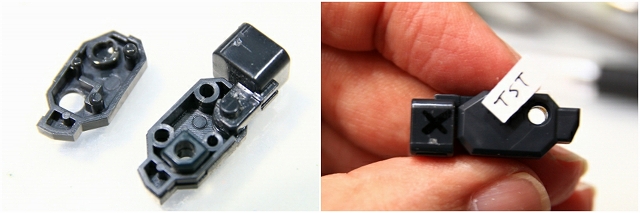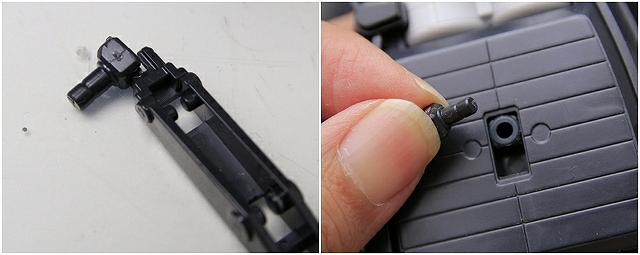 全重量をここで支えるのでかなり強度が必要なのですが、そのためのフィットを摩擦とプラの可塑性に頼っているので、プラに非常に負担がかかっています。さらに金型劣化でハメ合わせも悪い。そのまま組むと破損します。ここは調整のレベルではなく、いったん完全にスナップフィットを解除して、別の方法で固定したほうが良いです。