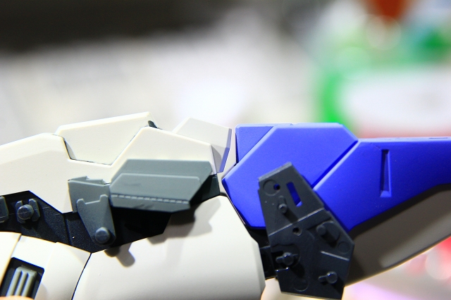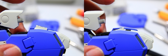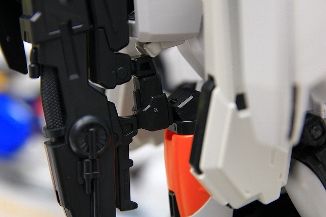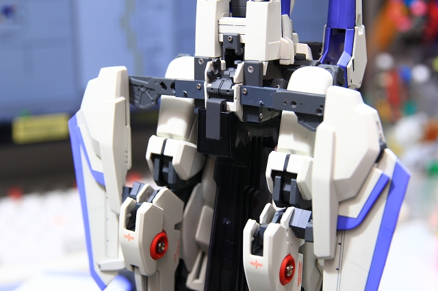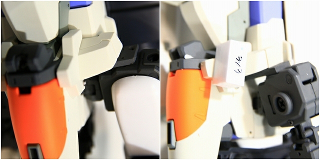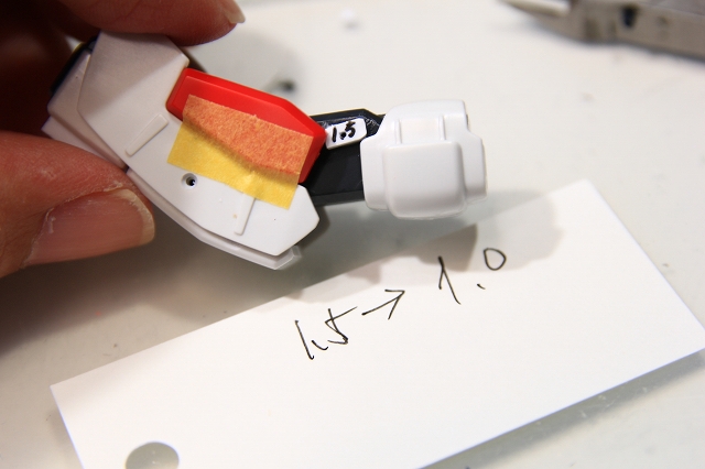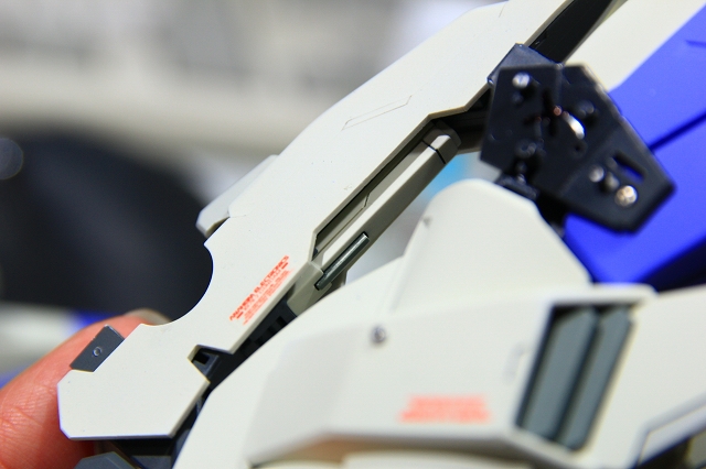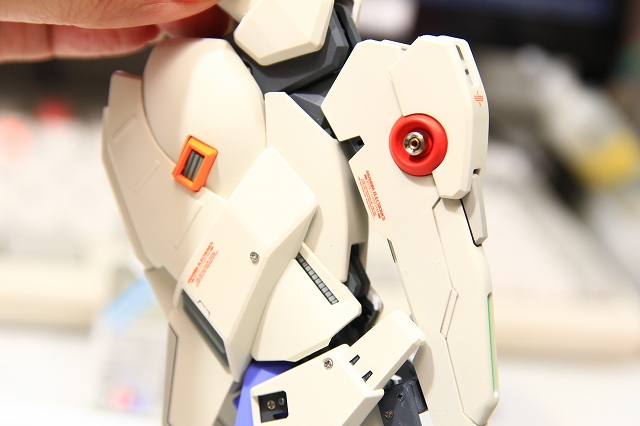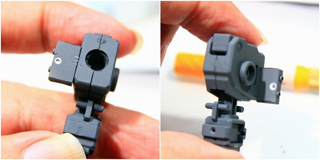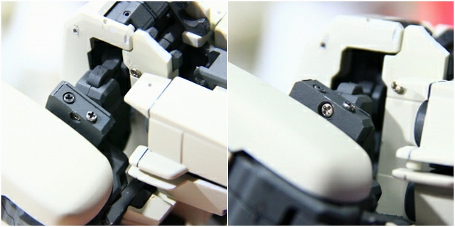 MSでは肩の可動のためのスキマがあります。Gクルではストッパーで固定されるようになっていますが、ちょっと強度不足。というわけでピッタリスペーサーを埋め込んでしっかり固定。