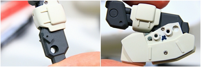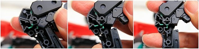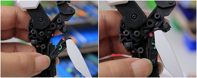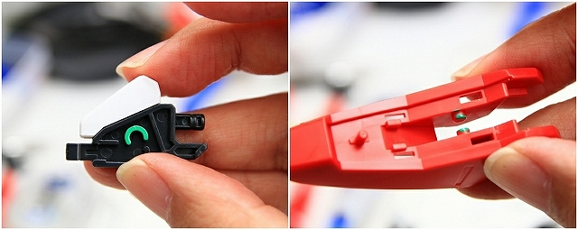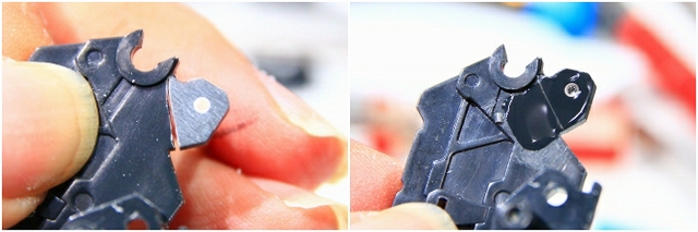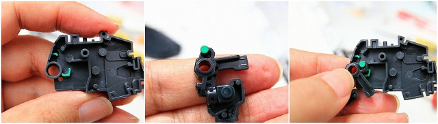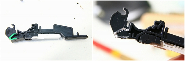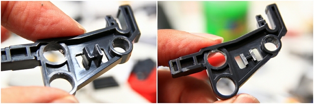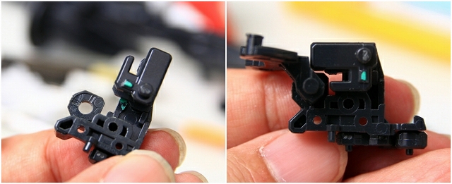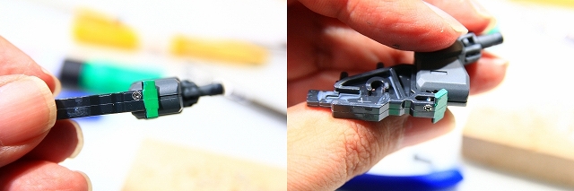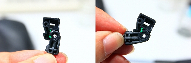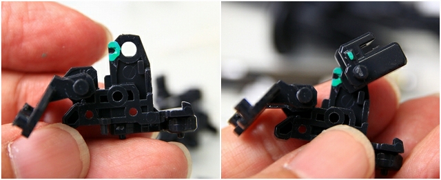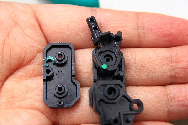 緑色がストッパーの位置。左がMS、右がGC。このパーツはノーマルでネジ止めなので、ネジを強く締めることで強度を高めることもできます。しかし締めすぎるとプラがナメるので注意。ちなみにネジがナメやすいのは全パーツ共通ですので締め付けトルクに注意。