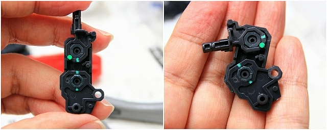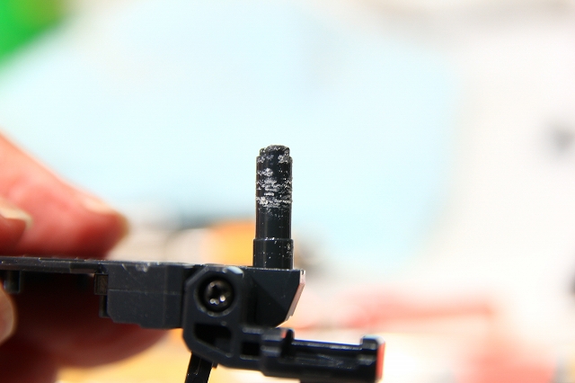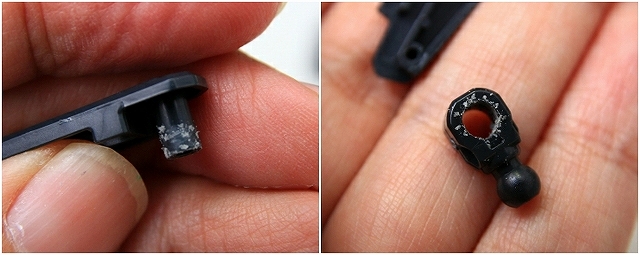 なんか可動が硬いな〜という感じと同時に「パチパチ」という音が発生。そのあと完全に固着して回らなくなります。接着したのと同じくらい固着してるので、ここからの調整や、分解するのもほぼ不可能です。パーツを破壊して外すしか方法がありません。焼き付いたパーツは写真のように粉を吹いてるのが特徴です。