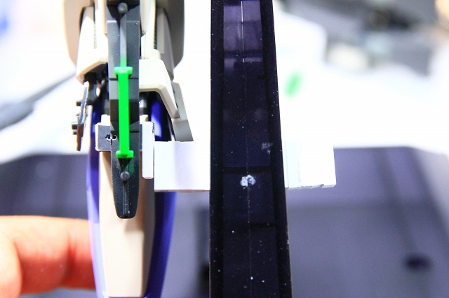 重量のある肩&プロペラントタンクを、緑色の丸軸とストッパーで支えます。強度と精度が必要な部分なのでだいぶ時間をかけて改修しました。