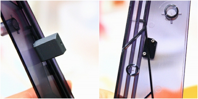 スタンド側も裏リブがあるのでマウントの位置が制限されます。クリアーパーツなので加工も最小限にしたい。