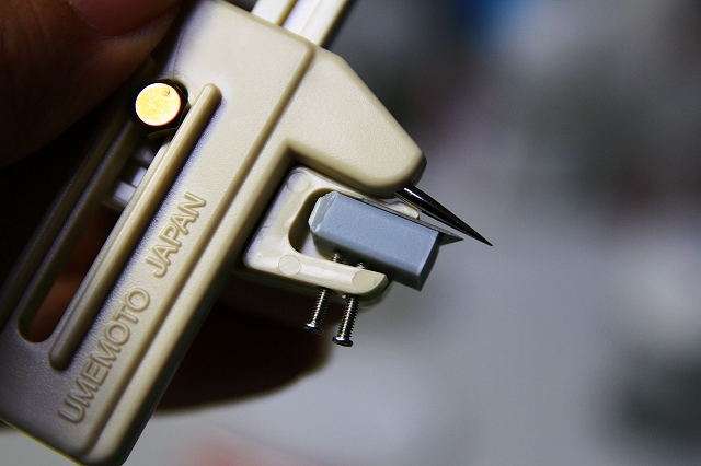 サークルカッター。一見便利そうですが、まったく使えない。ネジをどんなに締め込んでも刃物まで届かないので、刃がグラグラ。これは設計ミスで不良品なのを知ってて、そのまま販売してますね。