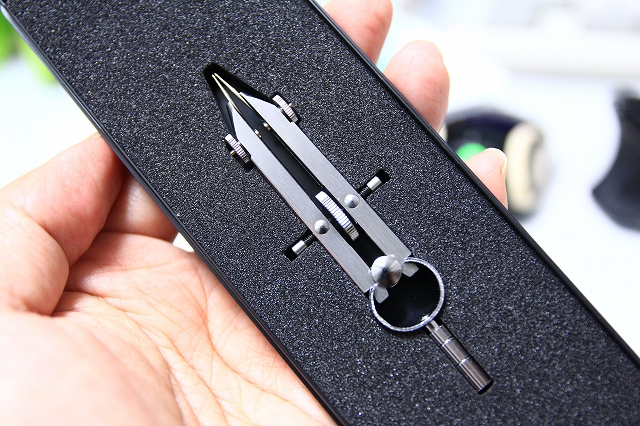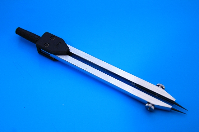 先端交換でディバイダとコンパスになるもの。使用頻度高いです。中折れ機構があるので先端を逆V字にできるのが便利。