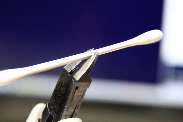 普通の綿棒です。軸の素材は紙・プラ・木・竹などいろいろあって、用途によって使い分けてます。自分は特に紙製を頻繁に使ってます。