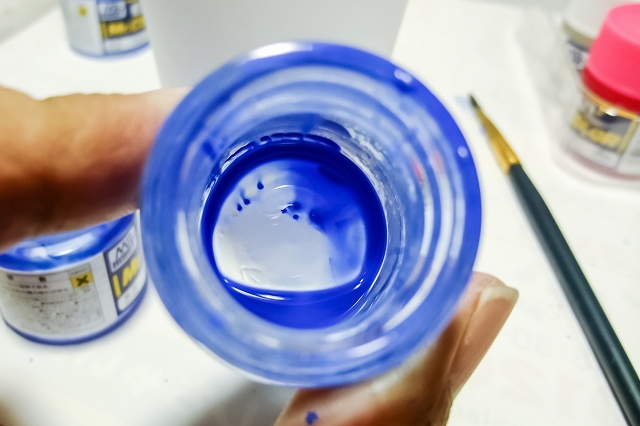 ビン底に溜まる塗料は、重い成分=全体の色味を決める、という重要な役割があります。つまりこの沈殿成分が混ざっていないと、色味が不安定になります。特にメタリック、つや消し添加剤、蛍光色などは重要成分が沈殿しやすく、本来の色味を出すのが難しい。それを知らなければ、本来の色じゃない色で塗装していることになるし「右手と左足の色味がなんか違う!」ということにもなります。