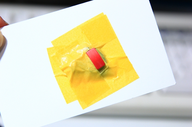 マスキングテープのスプリングバック対策はいろいろあるのですが、今回のような部品形状の場合、平らな台紙に貼り付けるのが良いです。