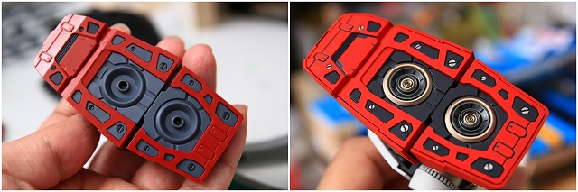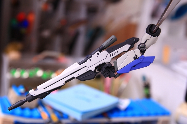 制作する前から「この機体は左向き(上手)にディスプレイする」と決めてました。となると左手にシールドがあると本体が隠れてしまう。なのでシールドを右手に持つように改造した例です。